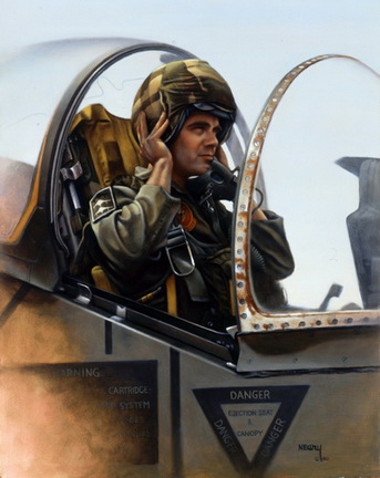 The last two AV-8B Harrier pilots completed their training in 2024. An aircraft that can deploy like a helicopter but operate as an attack aircraft has been part of the Marine Corps arsenal since 1984. This vertical/short take-off and landing (VSTOL) aircraft can land and take off from makeshift airfields near the front lines, forward operating bases, and amphibious assault ships. And it delights airshow audiences as it noisily hovers above runways. Major Lloyd Omps was doing just that in Oshkosh, Wisconsin, in 1986 when artist Donna Neary photographed and then painted him.