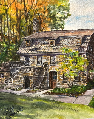 I painted this watercolor painting of The Pioneer Pavilion en plein air on a beautiful autumn day in Mill Creek Park. One of the oldest structures in Youngstown, The Pioneer Pavilion constructed from hand cut sandstone was a mill for carding and fulling wool in 1821. A millrace from Mill Creek and a waterwheel on the west side supplied the power. In the 1830s it was converted to a storage facility for the nearby Mill Creek Furnace and later served as a cattle barn. In 1891, Volney Rogers purchased the property and in 1893 turned it into a dining and dancing facility, naming it Pioneer Pavilion. Generations of area residents continue to enjoy social events in this historic landmark. Although I couldn’t find it documented anywhere, one day while going through the stone cave addition a manbpointed out a carving of a child’s face he heard was the image of one of the stonemason’s son.